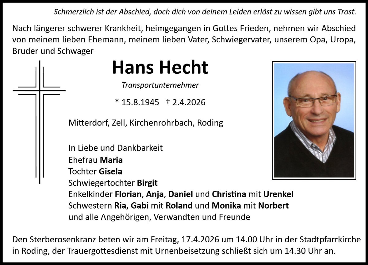 Unser Leben wird gewandelt, nicht genommen.🍂🍁 Liebe Frau Hecht und Familie, wir entbieten unser aufrichtiges Mitgefühl und wünschen Kraft und Gottes Segen. Lieber Hans, lebe in Christus. 🕯 Mit stillem Gruß Fred und Anita Reger