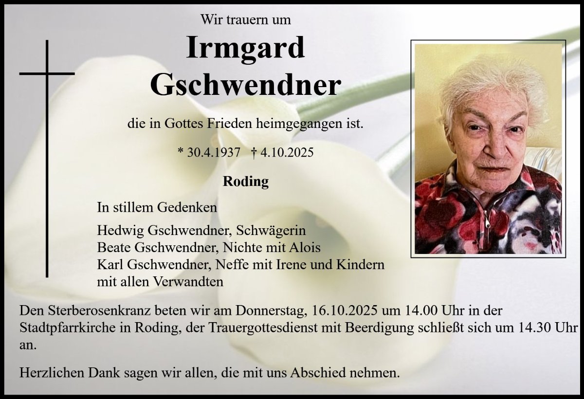 Irmgard Gschwendnergestorben am 4. Oktober 2025