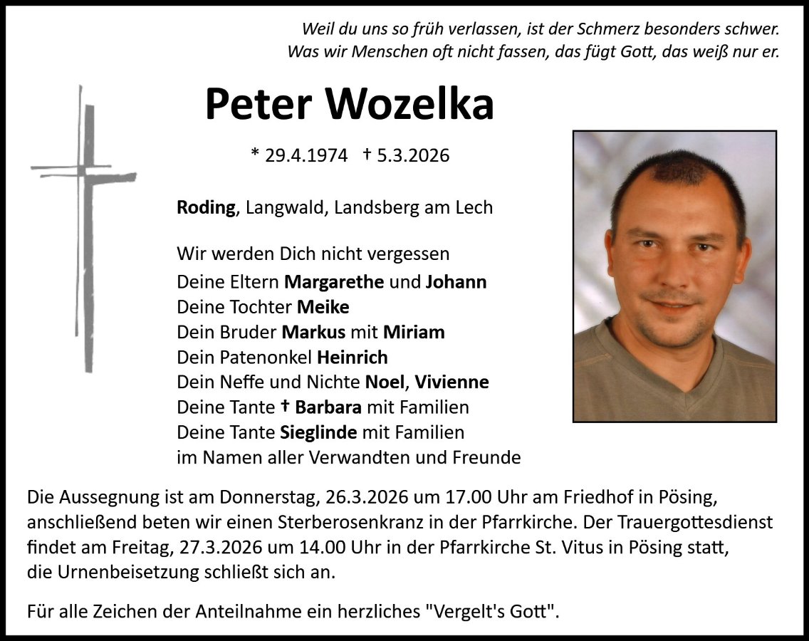 Das einzige Wichtige im Leben sind die Spuren von Liebe,die wir hinterlassen, wenn wir weggehen.Albert SchweizerLiebe Angehörige,wir entbieten unser aufrichtiges Beileid und fühlen tief im Herzen mit euch Allen.Lieber Peter Wozelka, ruhe in Frieden🌹🙏🕯️
